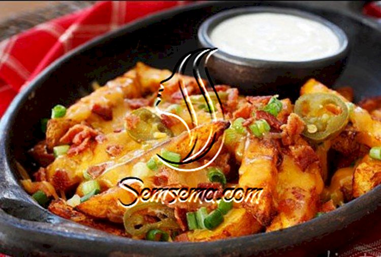 9. في طبق بايركس توضع البطاطا المقلية وفوقها طبقة المايونيز ثم اللحمة ثم جبنة المازوريلا ثم توضع في الفرن حتي تذوب الجبنة ثم ترفع من علي الفرن وتقدم مع الناتشوز وبصحة وعافية