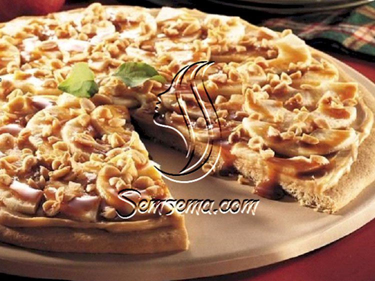 حلى التفاح بالمكسرات ، بيتزا التحلية الغنية بالنكهة والطعمة مع شرائح التفاح والمكسرات المرتبة على حشوة الجبنة الكريم وزبدة الفول السوداني المنكهة بالفانيليا، ويتم خبز العجينة بالفرن قبل وضع الحشوة عليها، ليتم تقديمها مع رذاذ الكراميل المفضل لدينا على وجهها .