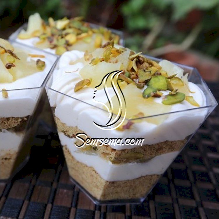 3. حضري أكواب التقديم، ضعي مقدار ملعقة من البسكويت المكسر بقاع الكاسات، رشي البسكويت بملعقة كبيرة من عصير الأناناس، ثم ضعي طبقة من الكريمة المجهزة، وطبقة من شرائح الأناناس، وضعي القليل من الفستق الحلبي المفروم.