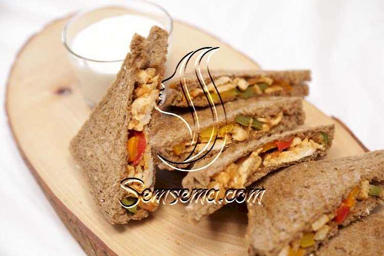 3. للتقديم: ضعي كمية من خليط الدجاج فوق شريحة من التوست، وغطي بشريحة أخرى.