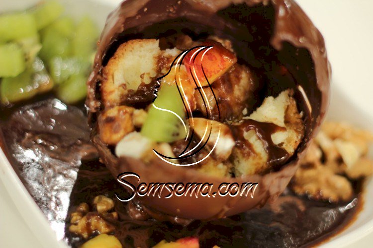 3. للتقديم: في طبق تقديم مناسب ضعي نصف كرة من الشوكولاتة (ثبتي القاع بقليل من الشوكولاتة المذابة).