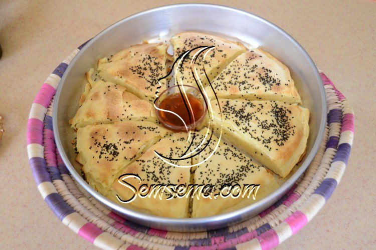 4. نأخذ كل قسم من العجينة وترق وتضاف في صينية الخبز وتدهن وجهها وتضاف طبقة تلو أخرى من العجينة مع دهن بينهما سمن وهكذا حتى تنتهى ونرش على الطبقة النهائية سمن وحبة البركة، ونضعها في الفرن لمدة 30 دقيقة حتى يحمر وجهها.